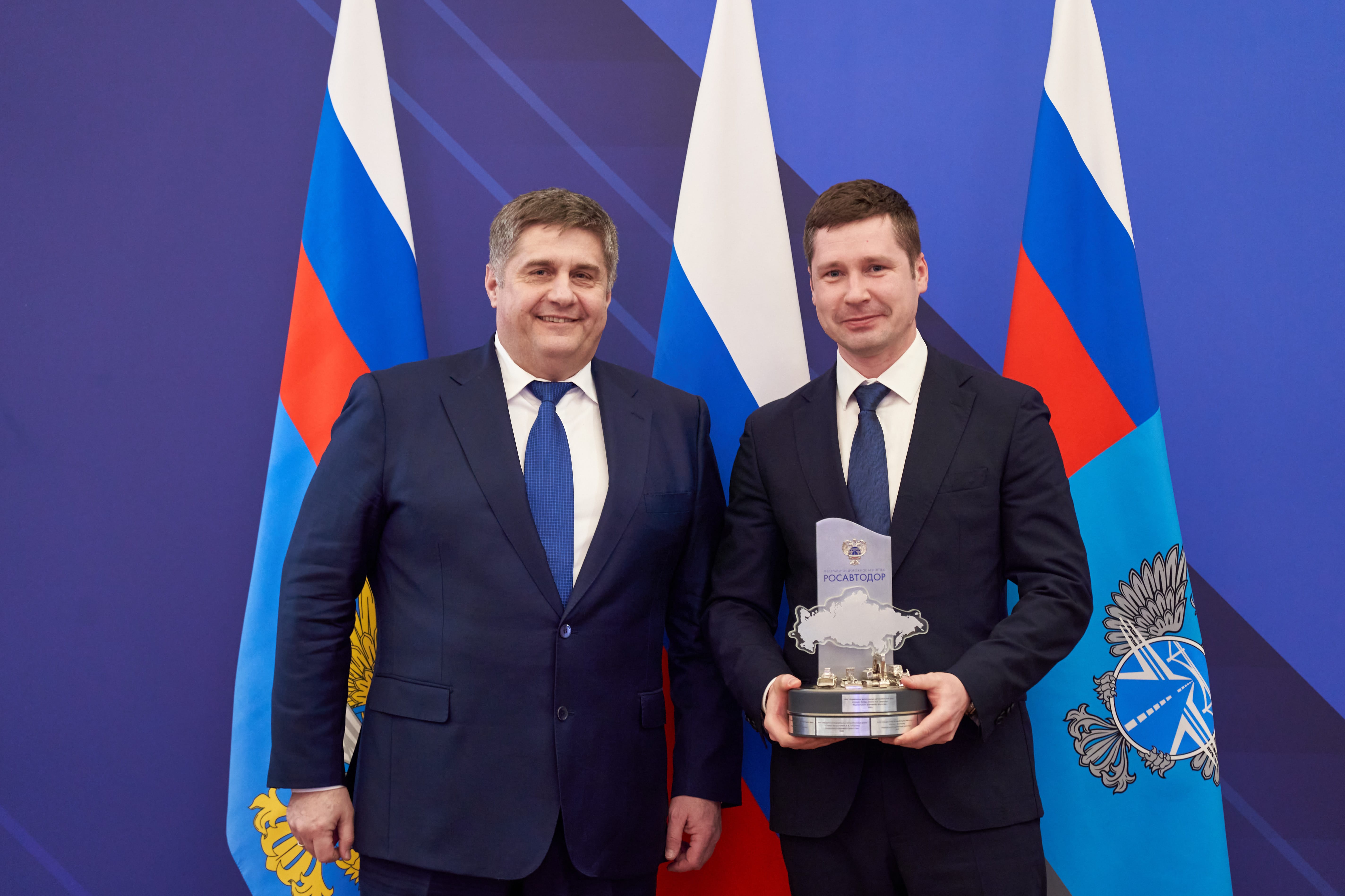 Кроме того, в конце мероприятия были награждены подведомственные Росавтодору ФКУ в рамках подведения итогов ежегодного ведомственного конкурса «Лучшая служба». Абсолютным победителем, отмеченным специальным переходящим кубком, стало ФКУ Упрдор «Северо-Запад».